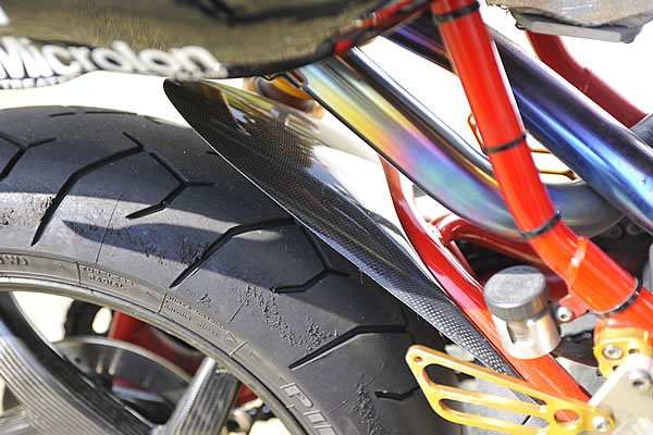インナーフェンダーもカーボンに換装、さらにホイールもカーボン製と軽量化にもこだわったカスタマイズが施されている。見た目だけではなく走りも追求してこそ、ドゥカティのカスタマイズだ。