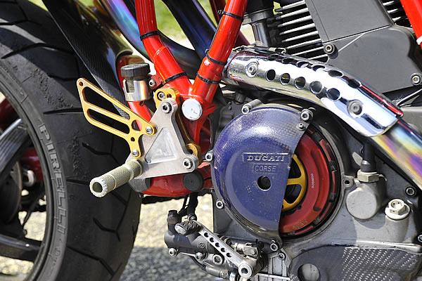 STMスリッパークラッチやBabyFaceステップなど、定番ともいえるパーツを組み込みつつもクラッチカバーやリアブレーキリザーバータンクのカバーなどは自作の品。カスタマイズを楽しんでいる。