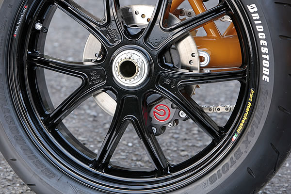 マルケジーニ製Y字10本スポークに換装したホイールは、モダンなムードを醸すのに貢献。ブレーキキャリパーもレーシングスペックのものに変更。足回りは最新スーパーバイクも見劣りするほどの豪華装備だ。