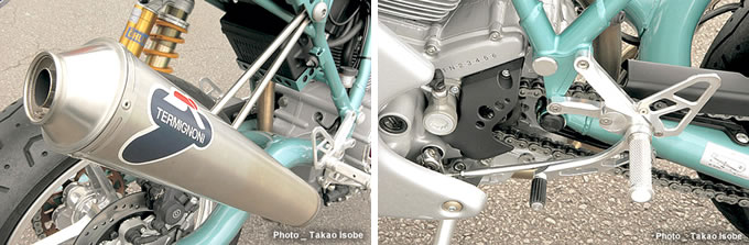 【左】テルミニョーニのスポクラ用 2in1メガホンマフラーは、軽快なリアビューを生み出す効果も持ち合わせている。 【右】美しい造形を見せるステップとクラッチカバーはお馴染みのアエラ製。ステップの作動性は極めて良好。足の納まり具合はもとより、シフトも気持ち良く決まる。