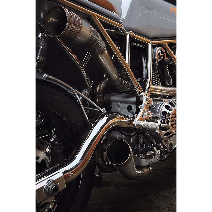 STDでは大柄なタンクが被せられているPYROのSportClassicだが、フレーム幅に合わせたタイトなワンオフアルミ外装にチェンジすることで、美しいパイプワークが楽しめる。STDの良さを生かしたカスタムと言える。フロントフォークはSTDだが、アウターのゴールドアルマイトを旋盤で削った後にポリッシュをかけている。マフラーはスイングアーム形状を生かしたワンオフ品。輪切りパイプの溶接を駆使して製作している。