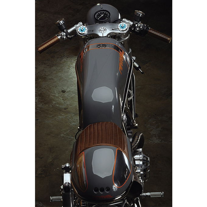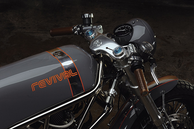 アヴァンギャルドなドゥカティを製作するリバイバル・サイクルズ。これまでも様々なカスタムドゥカティを手がけているがこのPYROと名付けられたマシンは、スポーツクラシックに彼らの世界観を凝縮した珠玉の1台。フレームはSTDをベースにシートレール部分をワンオフ、クロームメッキを施すことでトレリスフレームの美しさを際立たせた。品の良さを感じさせるタンク&シートは、フレームラインを生かす形状にワンオフ。現代的なカフェレーサーを作り上げた。