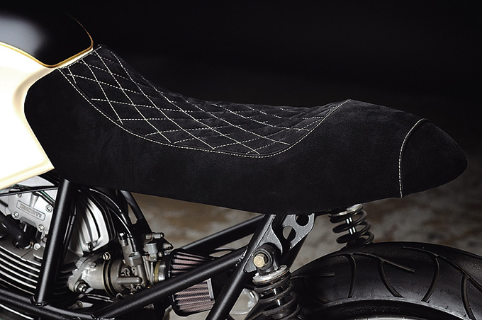 元は不動車だったパンタを大胆にカスタムしたThe Fifteen Hundred。一番の大加工は、シート下のフレームをカットしてシートレールを作り直したことだ。そこに載せられたシートはバックスキンを貼り込んだ上質なもの。タンクはSTDをベースに加工したほか、エンジンは全バラ後にフルリビルドされ、ワンオフマフラーをセット。今後は足周りのモデファイが予定されている。