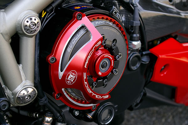 走りのクオリティを高めるのはもちろん、大胆なオープンタイプカバーが存在感を主張するSTM製レーシングスリッパークラッチ。