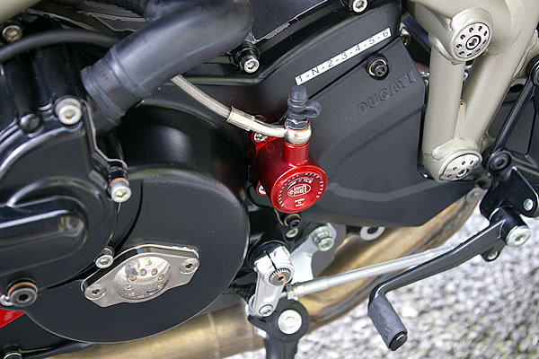 STM製クラッチレリーズシリンダーは操作性の改善に役立つ機能パーツ。カラーはレッドをセレクトし車体とのマッチングも良好。