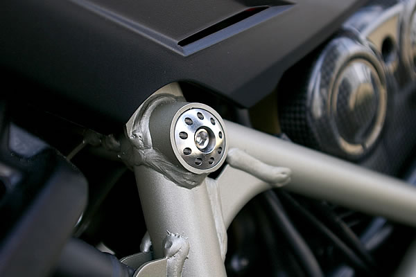デザインされたチタン製のフレームプラグ。ドゥカティでは定番となったカスタムパーツだが、王道だからこそできる美しさがある。