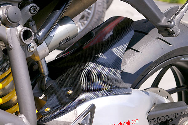 スタイリッシュなスーパーバイクに似合う素材はやっぱりカーボン。鮮やかなイエローに対するアクセントにもなっている。