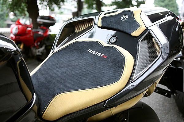 ブラックとイエローのツートンカラーへとシートレザーを変更。モトコルセが作るオリジナルシートは、ファンからの評価も高い注目アイテムだ。