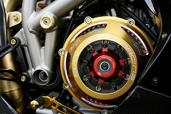 STM製エボルツィオーネレーシングスリッパークラッチを装着。組み合わせるカバーはもちろんゴールドを選択。赤とのコントラストが美しい。