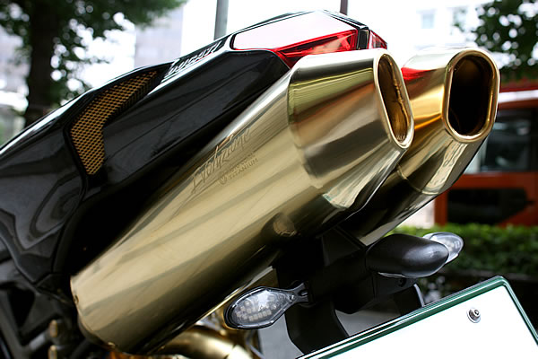 車検に対応するモトコルセ製チタンエキゾースト。表面色はナイトライド加工済みだ。メッキなどではこの深みのあるカラーは作り出せない。