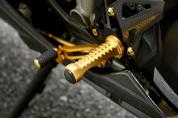 バックステップも加工済み。メッキだと激しいステップワークで表面が剥離する可能性があるが、浸透するナイトライド加工なら安心してライディングできる。