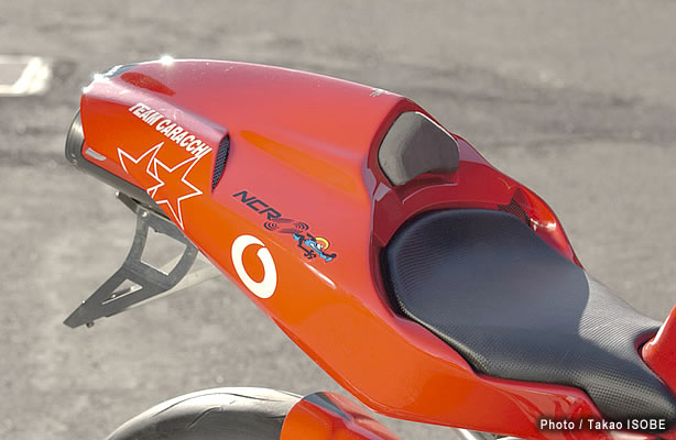 WSBK選手権にシリーズ参戦するスクーデリアNCRチームとは別に、チーム監督のステファノ・カラッキは、彼自身のレーシングチームを以前から運営してきた。ここに紹介するのは、そのスクーデリア・カラッキチームのイメージカラーに塗られた749Sである。ご存知のように、ヨーロッパではWSS選手権が大人気だ。当然ながら、数多くのドゥカティファンが749シリーズに注目している。そこでステファノ・カラッキは、チームイメージをまとめた1台の749カスタムを製作した。