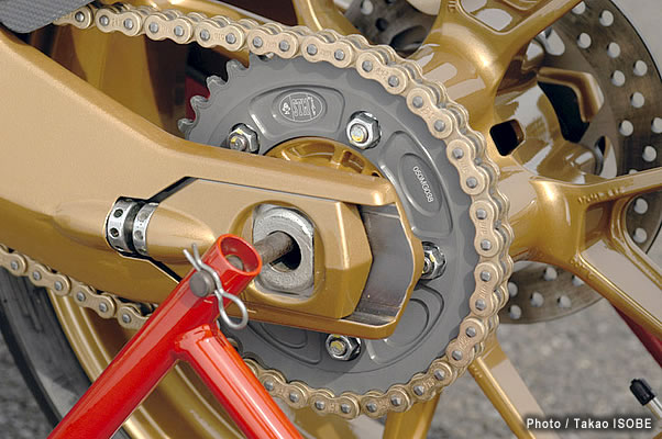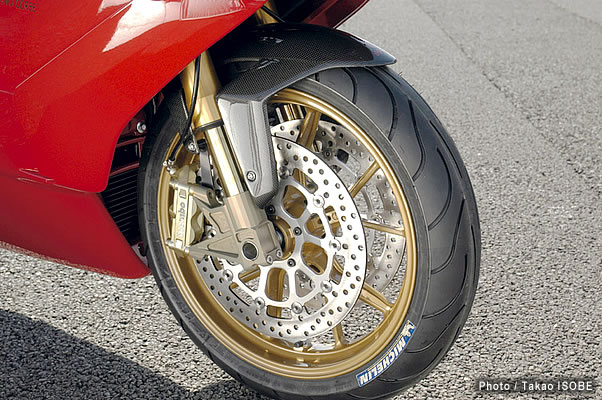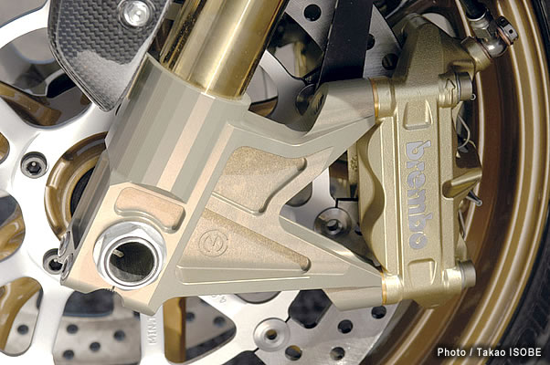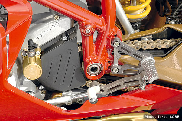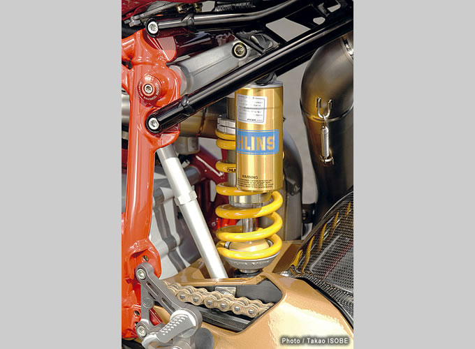 モトコルセでは、以前から独自のカスタムコンプリートを提案。このマシンは、999Sをベースに開発された999SCと呼ばれるモデルだ。その基本メニューは、フロントブレーキをラジアルフィックス仕様にするため、オーリンズ製倒立フォークに同社オリジナルのアルミ削り出しボトムケースを組み込む。キャリパーにはゴールド仕様のラジアルフィックス&ステンメッシュホースを組み合わせている。ディスクローターには、ラジアルフィックス対応パーツを採用。また、ドゥカティのアイデンティティであるパイプフレームは、その美しさを際立たせるためにテライオロッソ=赤フレーム仕様とされている。