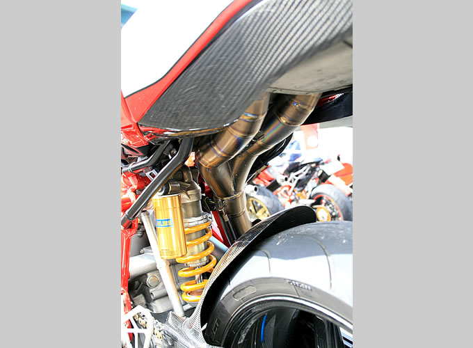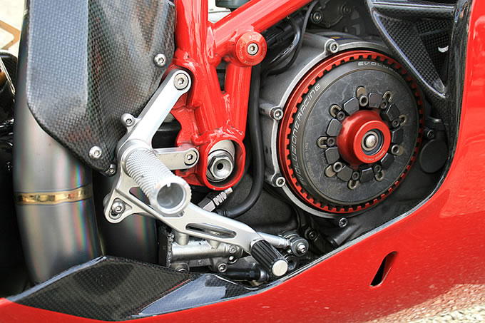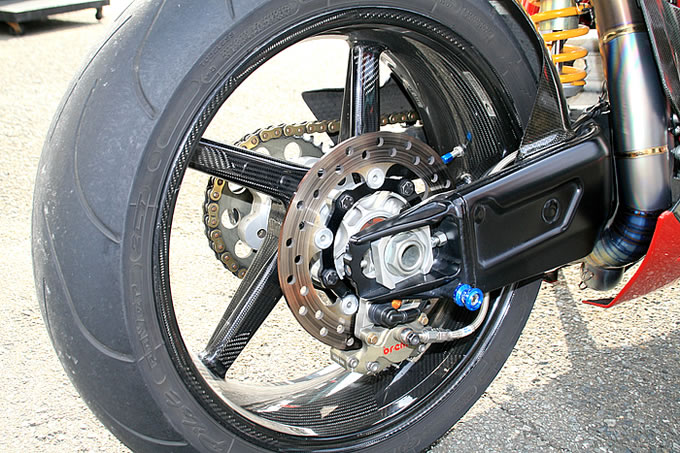 999R は純正でカーボンの外装を採用しているが、さらにパフォーマンス製のカーボンタンク、カーボンホイールなど軽量化を徹底。さらに排気は 999RS をイメージして製作したワンオフのチタン製フルエキゾースト。これらの軽量化の効果は大きく、自分が巧くなった気がしたとか。