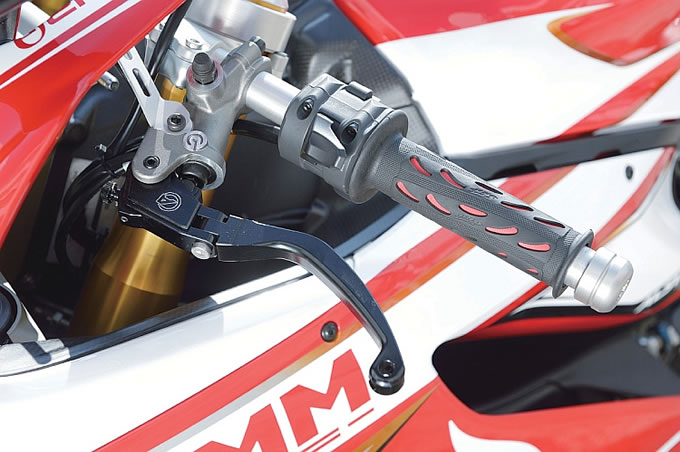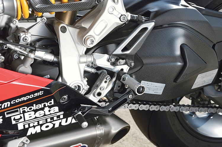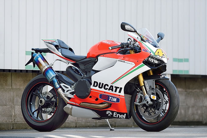 カルロス・チェカのカラーリングレプリカには、テルミニョーニのフルエキゾーストマフラーや、ドゥカティパフォーマンスのステップ、ベビーフェイスの リンクロッド、アクティブの可倒式レバーなども組み込まれている。「ファイナル・ロッシ」と銘打たれた 1199 パニガーレSは、マフラーはチタンのドゥカティ名古屋ノースオリジナルのアウトバーンを装着。そしてパールの入ったディープピンクにオールペンが施された 1199 パニガーレ “SP”。暖かな春をイメージして決められたカラーリングだ。