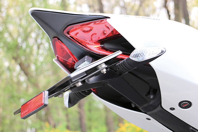 「速い乗り物が大好き」というオーナー。以前はスズキのハヤブサも所有。四輪車は日産のスーパーマシン GT-R を所有していると言う。エキゾーストパイプのカバー と インナーリアフェンダー は、ライディングハウスのカーボン。シートはドゥカティ東京ウエストのオリジナル加工品。イチオシパーツであるヴォーグの リンクアーム は、ロッドの支持部分にエキセントリックシャフトを装備し、無段階でレバー比の調整が可能となっている。リンクロッド もヴォーグのアジャスタブルタイプを使用。ステップ は、カッチリとした操作感が好みで選んだというアエラ。スクリーンはドゥカティコルセで、フェンダーレスキット はモトクレイジーをチョイス。