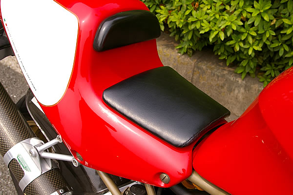 街乗り用のローシートとスポーツ走行用のハイシートを簡単に組み替えられるようにカスタム。写真はローシートになる。