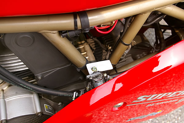 長期間乗らない場合を考えてフューエルコックを移設。燃料が残ることを防ぎ、保管時のダメージを最小限に抑えている。