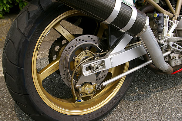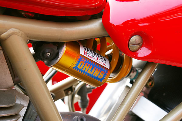 サスペンションは前後ともオーリンズ製へとリプレイスした。リアサスはさらにオクムラにてチューニングを施している。