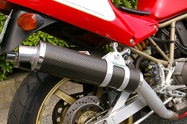 軽量なキジマ製カーボンマフラー。車体から離れた部分のマスを減らすことで、重量バランスをより良い方向に改善した。