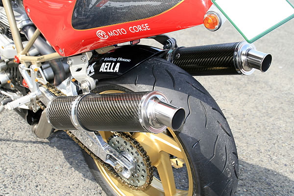 ライディングハウス製のカーボンサイレンサー。エキパイが描くラインはオーソドックスながら軽量化には抜群の威力を発揮。エンジンチューンにも合わせたセットにしている。