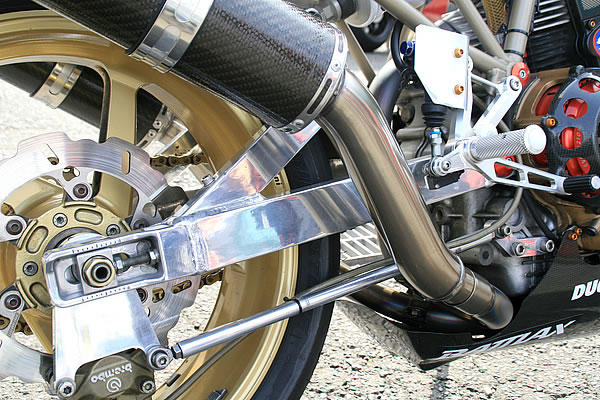 スイングアームは純正のままだがバフがけすることでアルミらしい艶を出した。無論リアブレーキもモダンなブレンボに換装して強化している。リアサスはWP製を入れている。