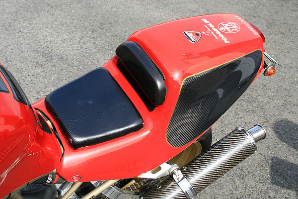 シートカウルはカーボン製で、やはりこれも軽量化の一端である。車体色と合わせてペイントして、カーボンの織り目をあえて少なくしている点にオーナーのセンスが伺える。