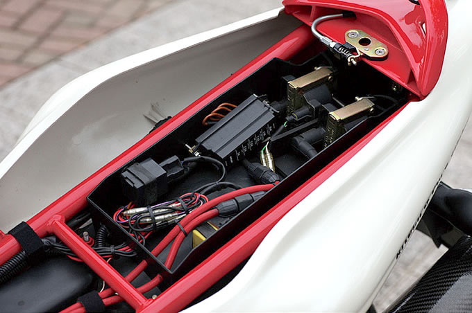 SSに限ったことではないが、カウル装着モデルは、そのカウルの下に様々は部品が納められている。その部品の一つであるイグニッションコイルはシート下に移設した。ハーネス類はフレームの裏を這わせている。