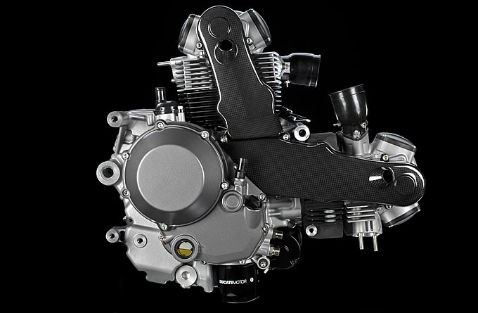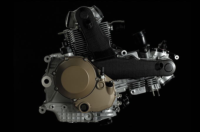 右の写真は、いわゆる「1100DSエンジン」でハイパーモタード1100に搭載されているものだ。ボアXストロークは98mmX71.5mmで、正確な排気量は1078cc。圧縮比は10.5:1で、バルブの開閉はデスモドロミックにより正確に制御される。点火方式はDS(=デュアルスパーク)の語源であるツインプラグ方式で、燃料供給には電子制御燃料噴射装置を採用。搭載モデルによって仕様に若干の違いはあるものの、軽くコンパクトなユニットでありながら、必要にして十分なパワーとトルクを発生するのは共通した美点だ。年々厳しくなる排ガス規制に対応するには不利な空冷2バルブという形式だが、ドゥカティの執念とも言える改良と熟成が加えられた結果、現行モデルではユーロ3に適合する。