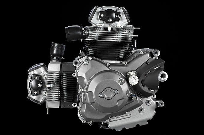 伝統的で「もっともドゥカティらしい」と評されるこのユニットは現在も進化を続けており、その過程で排気量やクラッチ形式などが異なるバリエーションを拡大。1000DS(排気量992cc)と合わせるとモンスターやハイパーモタード、ムルティストラーダ、スポーツクラシックなど、非常に多くの現行モデルに搭載されていることからも、その優れた基本設計と素性の良さがうかがい知れる。また、空冷2バルブならではの独特のトルク感と、淀みのない吹け上がりを兼ね備えるこのエンジンは、アクセルを開けた時の感触もドラマチック。まさにドゥカティが誇る「名機」と言えるだろう。なお、下の写真は先ごろ発表された新型モンスター1100で、エンジンは1100DSの最新版である。ハイパーモタードのものとは仕様が異なるのが分かる。