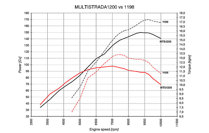 比較をわかりやすくするため、スペックはイタリア本国仕様のものとした。ちなみに日本仕様の最高出力はムルティストラーダ1200が102ps、1198が155psである。無論これは日本の排ガス規制、騒音規制に合わせた結果だ。