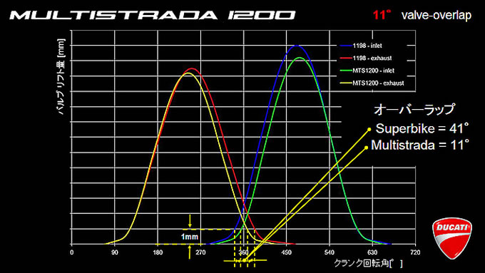 ちなみにバルブオーバーラップの間隔(アングル)は、テスタストレッタ・エボルツィオーネでは41°となっている。このオーバーラップアングルの違いは、それぞれこのような特徴となって現れる。
