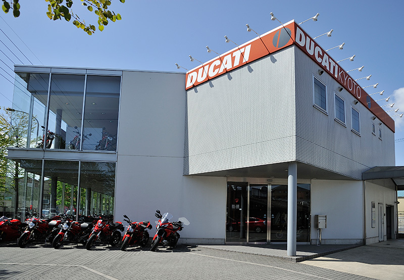 カスノモーターサイクルが運営するドゥカティ京都は、関西初のドゥカティストアとして 2002年8月にグランドオープン。ガラス張りと白い壁面が美しい店舗には、国内最大級の広さを誇るショールームにドゥカティの全カテゴリーの最新モデルを常時 25 台前後展示するとともに、各カテゴリーの試乗車も用意。ドゥカティアパレルや、ドゥカティパフォーマンスをはじめとする各種カスタムパーツも豊富に取りそろえている。また、店内には糟野氏こだわりのオーディオシステムを設置したカフェもあるので、ドゥカティに囲まれてゆったりとした時間を過ごすのもいいだろう。ツーリングや走行会など顧客向けのイベントも積極的に企画している。