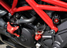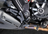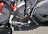 『ライディングステップキット』ディアベルの持つダイナミックなパフォーマンスが楽しめるライポジを実現するため、ノーマルから 30mm バック/20mm アップ、38mm バック/26mm アップの2ポジションを設定。車体色に合わせたブラックアルマイトカラーが渋い。