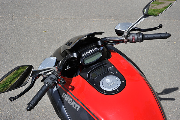 AELLA のパーツを装着したドゥカティ京都のディアベルに試乗してみた。変更されている点はおもにライポジ系とクラッチレリーズ、そして機能性を兼ねたドレスアップパーツで飾られている。まず、跨ってすぐにわかるのはライポジの違い。ノーマルはどちらかというとクルーザー的なポジション。つまり、ハンドルが遠く高いところにあり、ステップは低く前方にあるため、腰が引けた感じになる。特に国内仕様のシートは低いためその傾向が強く、電子制御の「スポーツモード」でキビキビ走りたいときなどは少々違和感があった。それが、AELLA 装着車はハンドル位置が手前に低くセットされ、ステップも程良く高く後退しているため、自然なネイキッド的なフォームになる。おまけにシートも純正オプションのコンフォートタイプが装着され、座面も高くフラットになっているので、着座位置も自由に移動でき腰への負担も少ない。ハンドルが近くなったおかげで、Uターンなどでフルステアしたときも外側の腕が伸び切らずに済む。全体的にコンパクトになりステップの踏ん張り感も増して、“スポーツできる” ポジションになったというわけだ。ディアベルのポテンシャルを考えれば、もしかしたらこちらが本来のライポジかと思うほど、フィットしていたのが驚きだった。