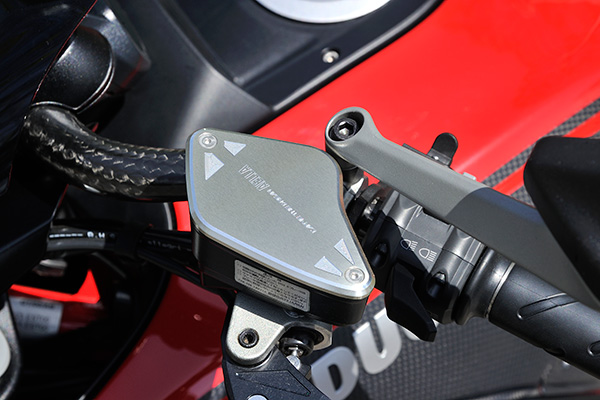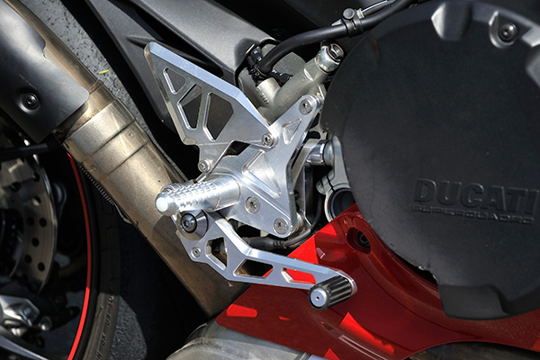 以前からひとつ大きく不満に思っていたのはステップが滑ること。ドゥカティが誇る最強のスーパースポーツなのに、ステップワークでずっこけるのは許しがたい。その点、AELLA のステップは踏み込んだときの剛性感やブーツの底の引っかかり具合が素晴らしい。ヒールプレートも分厚いアルミ削り出しで、ステップを踏み変える際の踵のホールド感もバッチリだし、ベアリングで支持されたペダルのスムーズでカッチリとした操作感に、「これこれ、ほしかったのは!」と思わずつぶやいてしまった。