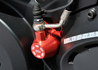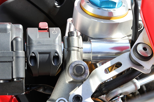 『クラッチレリーズシリンダー』パニガーレは他モデルに比べクラッチ操作は軽くなったが、スムーズな操作性を求めて開発されたニューバージョン。ピストン内部のアライメントボールや首振り防止ガイドの導入、ピストン自体にカシマコートを施すことで操作感を高めている。