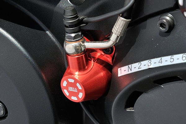 レッドアルマイト処理が施された削り出しパーツは、赤いフレームカラーとのマッチングもぴったり。機能パーツでありながらドレスアップ効果も抜群だ。