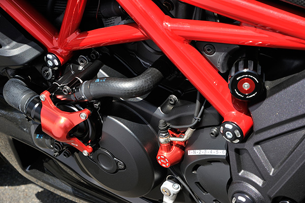 究極のスーパーバイク 1199パニガーレS をストリートでもより扱いやすく、日本人の体格にもフィットするよう、ライポジを中心にカスタマイズされている。
