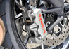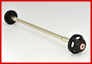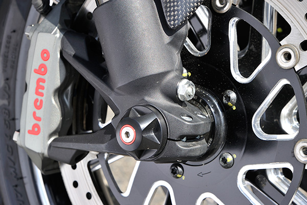 『フロントアクスルスライダー』シャフトにアルミを採用し、強度と軽さを両立。万が一の転倒では先端部のスライダーが衝撃を分散し、車体へのダメージを低減する。