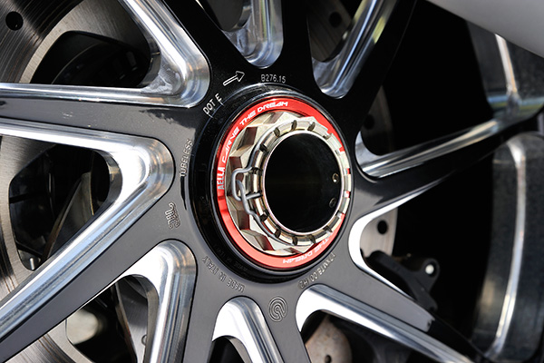 『チタンナット&テーパーコーンセット』ディアベルの片持ち式スイングアームをアピールするチタン製アクスルナット。レッドアルマイト処理にブランドロゴが入ったテーパーコーンの鮮やかさが目に焼きつく。軽量化にも貢献。