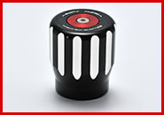『フロントマスタータンクキャップセット』アルミ削り出しのカバーはアルマイトを施した後に再び切削してロゴと模様が入れられる。しかもブレーキマスター用(右)とクラッチマスター用(左)で異なったデザインを採用するなど個性が際立つ。