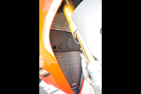 『ラジエタープロテクターセット』パニガーレの2段式ラジエターを飛び石や虫の汚れから守るコアガード。強靭さと耐腐食性を誇る SUS316ステンレス材を使用し、ダメージを受けやすいセンター部は細かく、外側へ向かって粗くメッシュをデザインすることで保護性と冷却効率を両立。