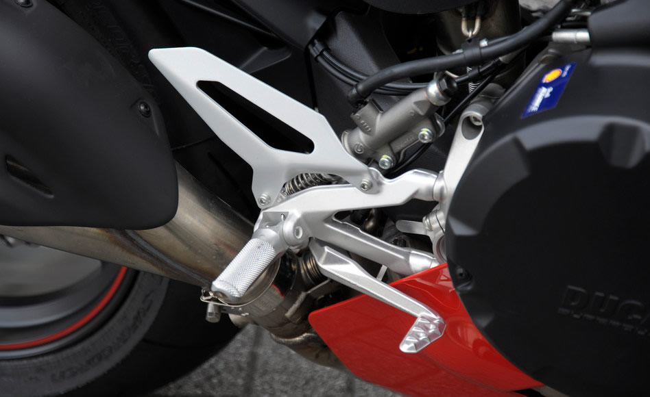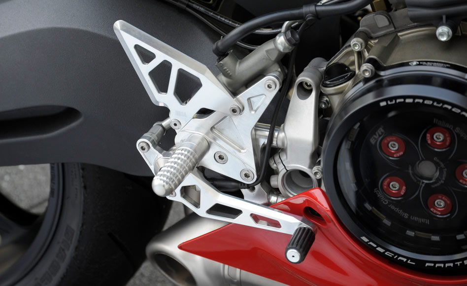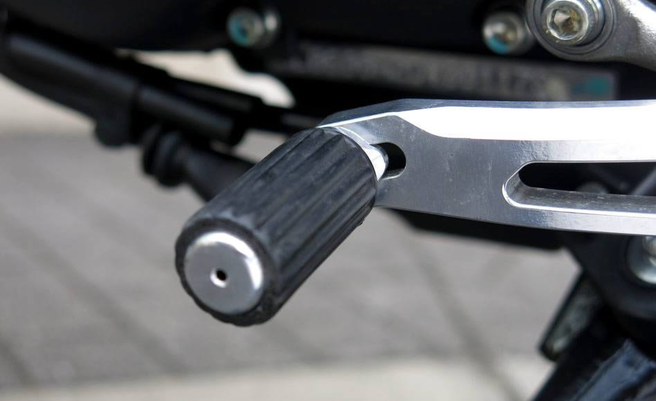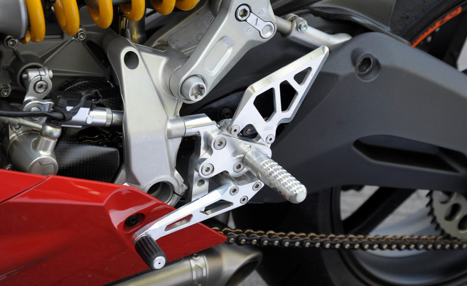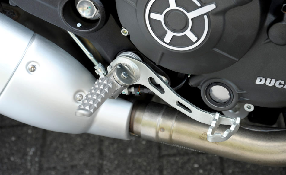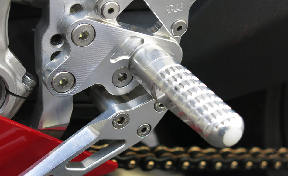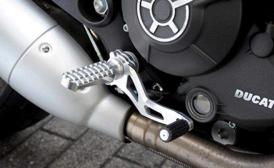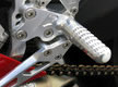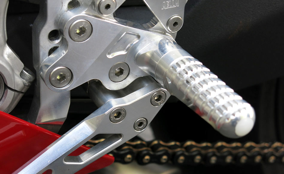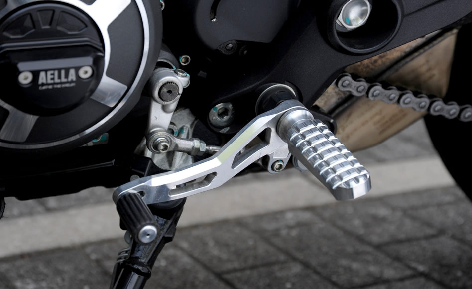 街乗りでの操作性を重視したスクランブラー用パーツは、ステップは高剛性なことが前提であるものの、細かいポジション変更はできない構造。その理由は、「設定の必要がない」ということ。ハンドルバーでの調整で、街乗りでも操作性の良いポジションを実現できるというのがアエラの答えである。対してスーパーバイク用は、徹底的にライディングポジションを微調整できる構造であり、スポーツライディングからサーキット走行までの操作フィーリングも、ライダーが徹底的に追求できるものとなっている。