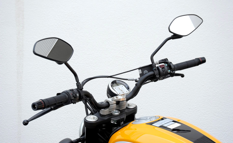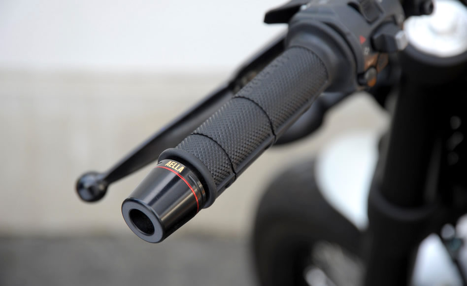 中島 :今回はスクランブラークラシックをモチーフとしていますが、そのままだとアップライトで乗りやすそうなんですよ。でも走行中は、いわゆる殿様乗りポジションでは、加速のGやブレーキングGに対応しにくい。降りた時の取り回しもアップすぎるハンドルバーでは不具合がありますね。それで少し幅を狭く、低いポジションで製作しました。グリップエンドも少し内側に向けて絞られています。