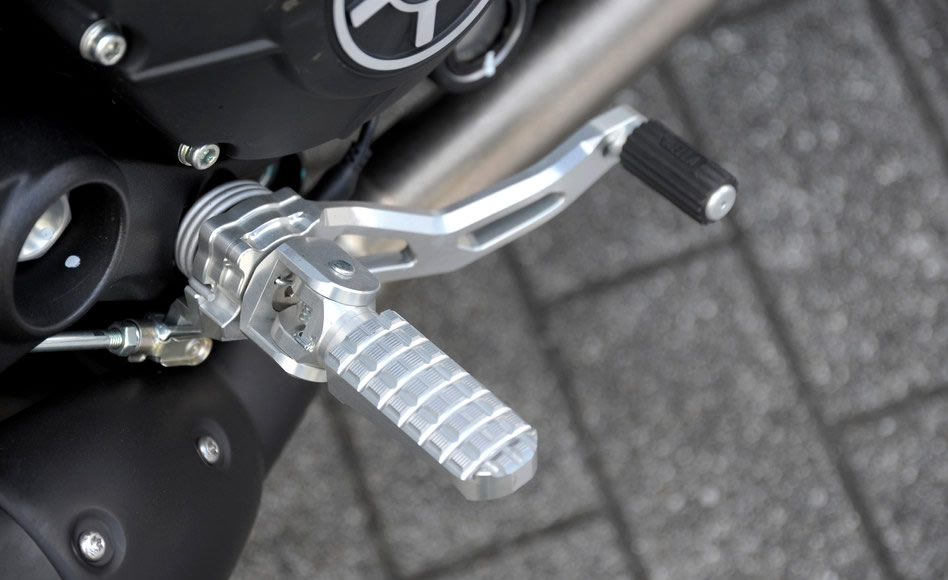 糟野 :固定ステップと可倒ステップの両方を製作しました。ライディングを安定させるには固定ステップが良いということは他の商品と共通で、ステップ自体は、少し軟らかいアルミ素材を使用して転倒時に折れにくいような配慮がなされています。可倒ステップは、オフロード走行時などの転倒で有利なように、ノーマルステップの良さも加味した設計になっています。