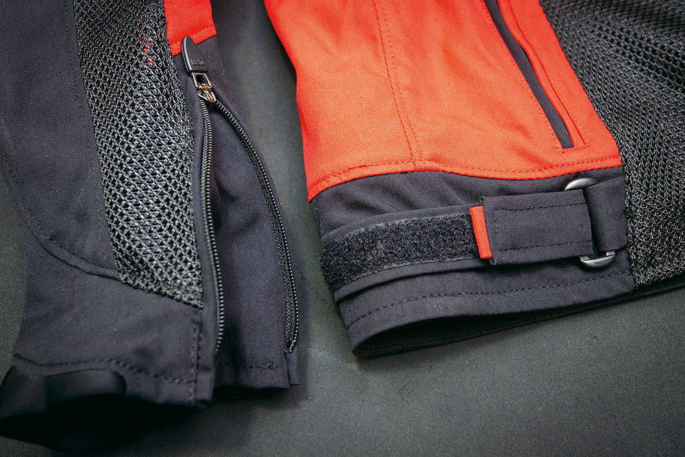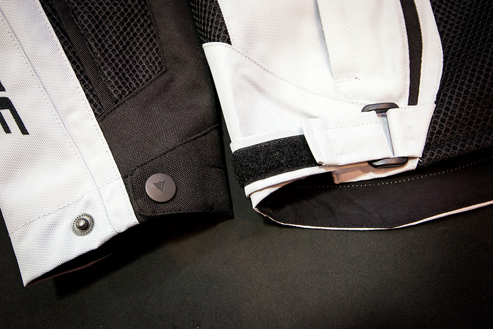 ウエストベルトはベルクロ、袖口にはファスナーを備える。腕にもサイズ調整ベルトが2本ある。