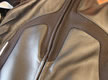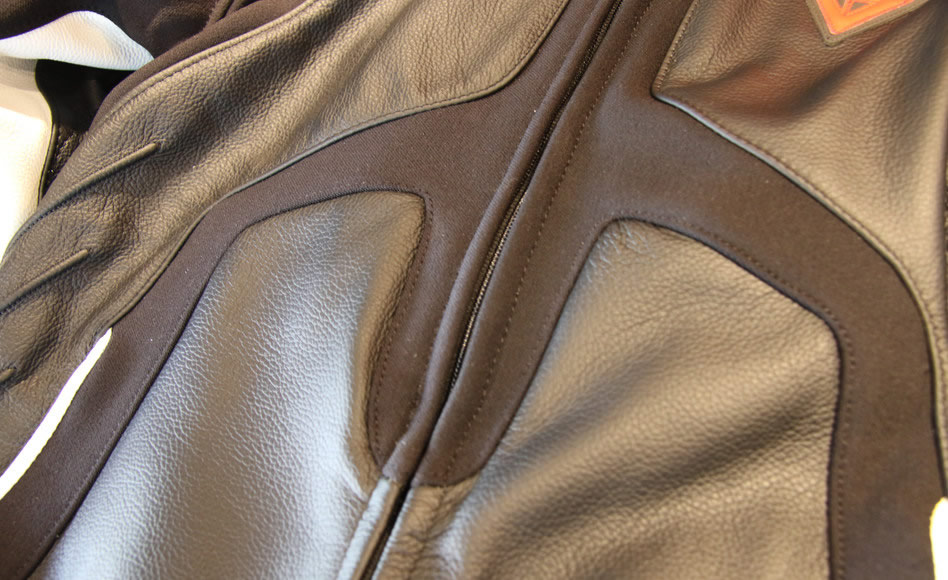 「革の裁断の仕方が特徴的ですよね。独特の面の取り方をしていることが解ります。そのせいか、着心地はかなりタイトです。正直なところ、ダイネーゼのレーシングスーツは、着る時も脱ぐ時もかなり面倒なんです。でも、着ている時の身体の動かしやすさは素晴らしいものがあります。