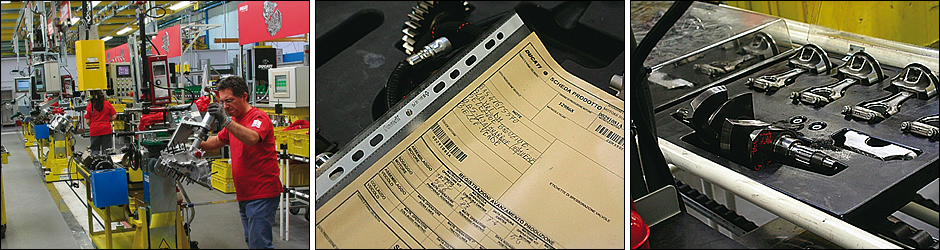 写真左は生産ラインの風景。中央はエンジンごとについて回る仕様書で、これを見れば担当者や使用パーツの内容等がわかる仕組みになっている。その右がパーツトレイ。パーツの形状を模ったクボミができており、ひと目でどこまでパーツを組み込んだかがわかる。簡単な仕組みだが、人の記憶だけに頼らない確実な作業をこなせるように考え抜かれている。