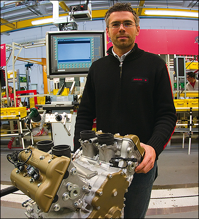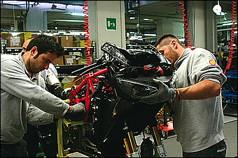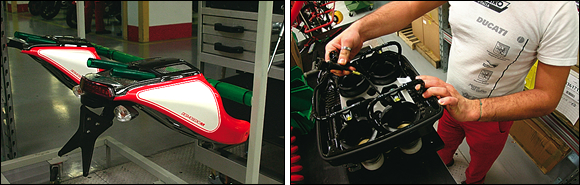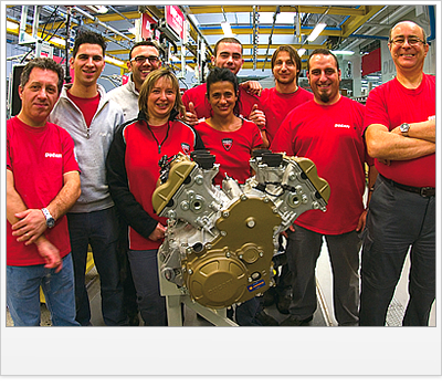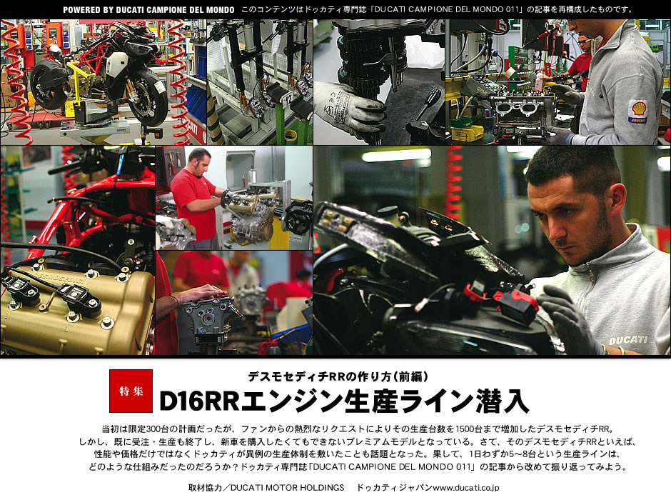 モトGPマシンゆずりのフレームコンセプトによるコンポジットの車体に抱かれるデスモセディチRR(以下D16RR)のエンジンは、世界に唯一のパフォーマンスを謳うこのリアルレプリカにとって、欠かせない中核部分です。このエンジンの組み立てには、設備的なテストも兼ねてですが、モンスターなど一般の量産車とはまったく別の、独自の生産ラインを設けて、作業を進めています。